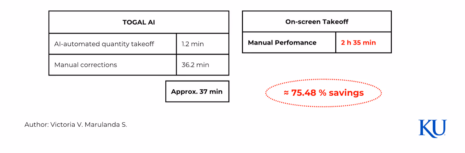 Independent research from the University of Kansas found that “Togal.AI offers substantial time savings as it allows the integration of AI features, combined with manual review.” When compared to manual estimations using On-Screen Takeoff, Togal.AI was 76% faster.