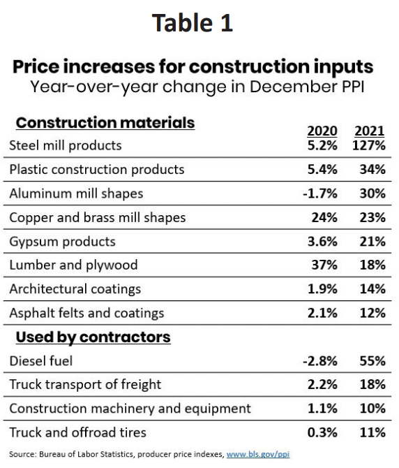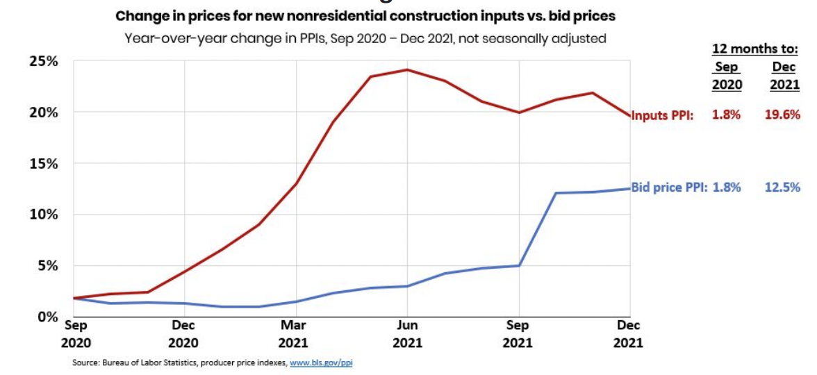 Based on the Associated Builders and Contractors (ABC) analysis of the U.S. Bureau of Labor Statistics’ Producer Price Index data, contractors have been hit hard and feeling the pinch on their profitability because of soaring prices that outpace the estimated bid prices. Since bids are on a contract, they cannot adjust based on price movement fluctuations and volatility.