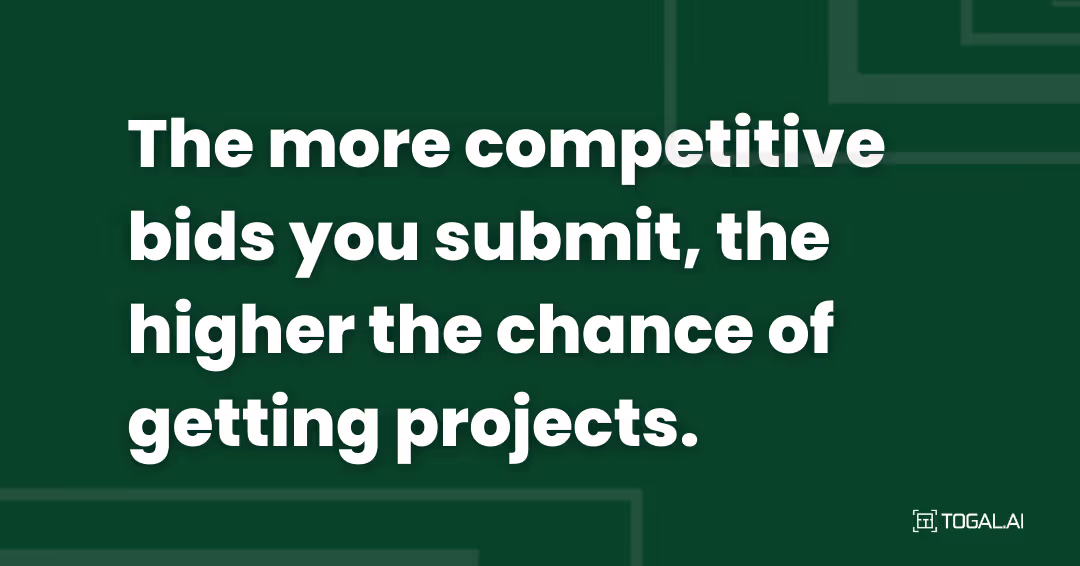 Togal.AI helps to increaseprofit margins by reducing pre-construction costs. Increasing the number of proposals sent annually will simultaneously increase the probability of being awarded more work and generating larger revenues.