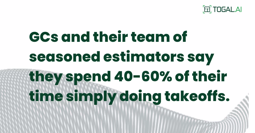 - Minimal time spent on value-generating activities - General Contractors and their team of seasoned estimators spend 40-60% of their time conducting takeoffs. While takeoffs are crucial to pricing a job, there’s little value generated from it.