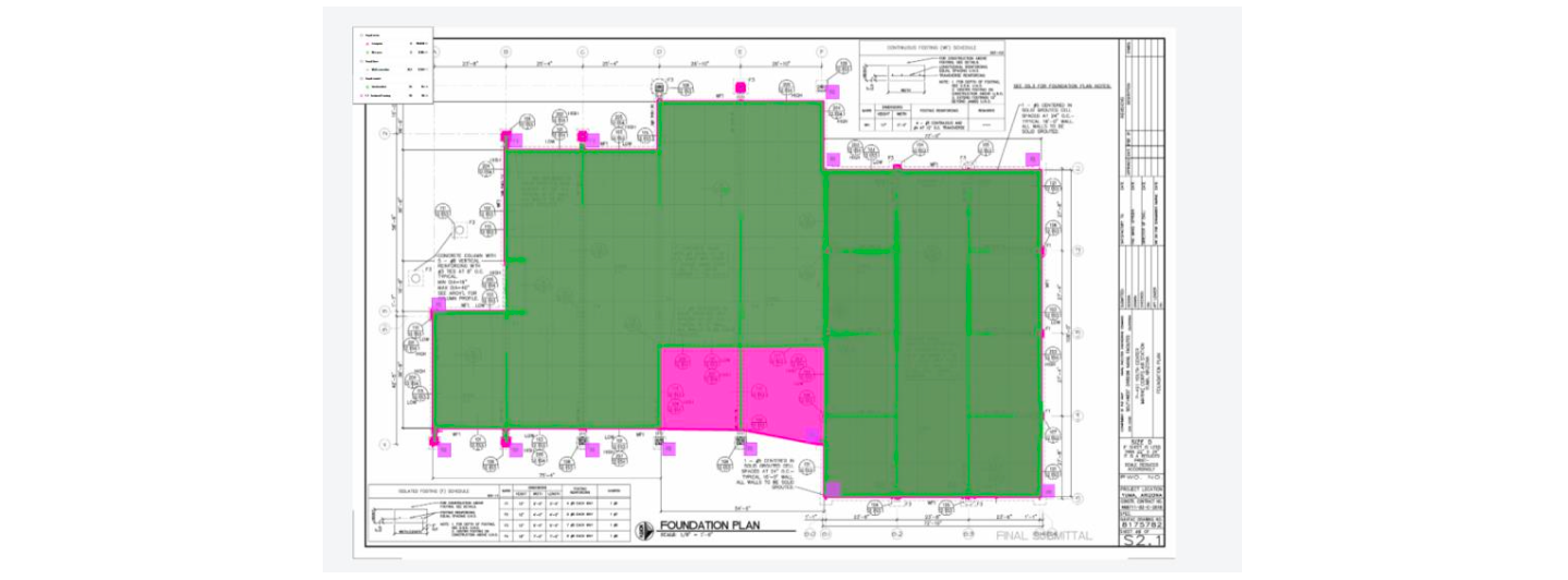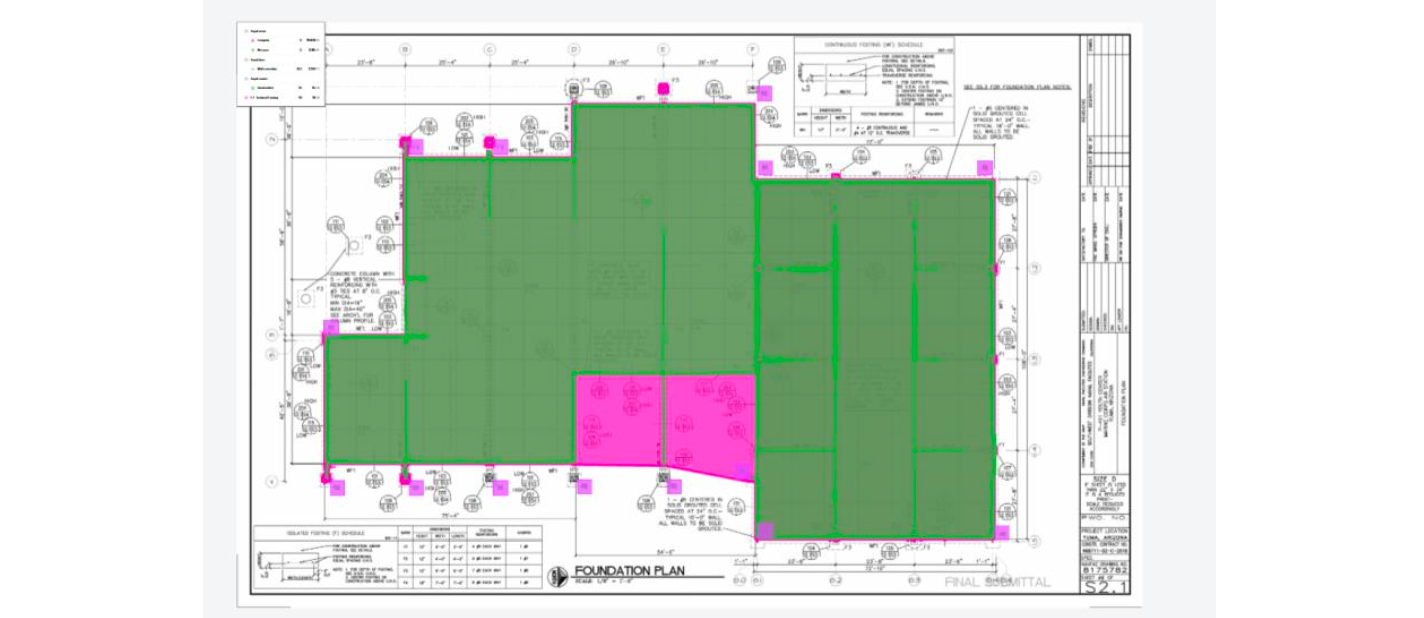 Additionally, with this floor plan, initial testing was conducted to evaluate how the AI Search Tool and computer-assisted area tracing performed in quantifying and calculating the area of the isolated footings (“F1”, "F2", "F3", and "F4 ").