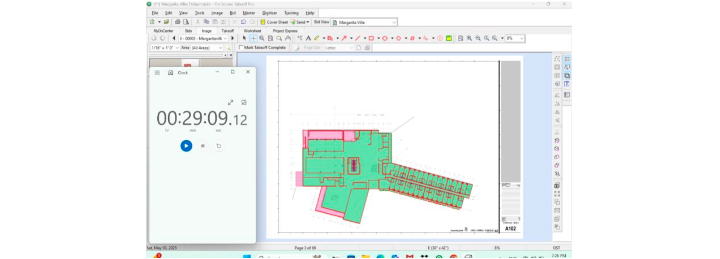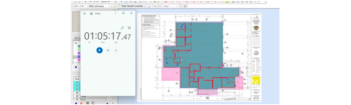 Based on the classifications obtained from Togal.AI, computer-assisted manual quantity takeoffs were then conducted for each category using On-Screen Takeoff, recording completion times. A comparison was made between the results from both tools, and the percentage differences between them were calculated.