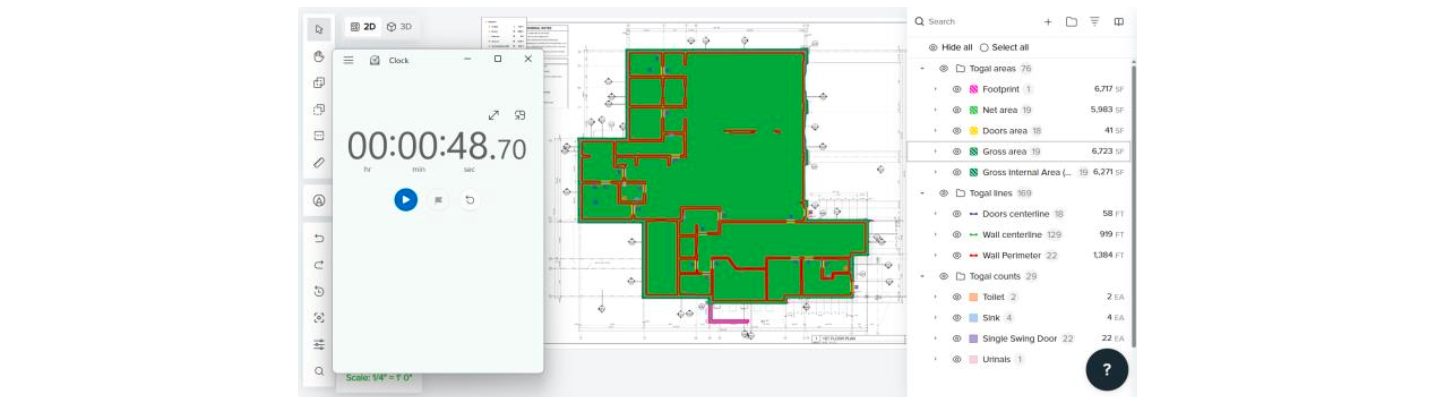 Using the AI-calculated “Gross Internal Area” quantity, separated by AI-identified spaces and rooms of the floor plan, additional efforts were made and timed to capture the duration spent on materials categorization, tracing adjustments, and the inclusion or exclusion of areas using manual and AI tools (Search Tool) offered by Togal AI.