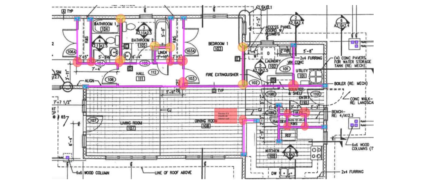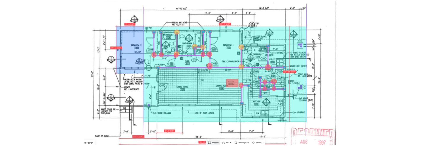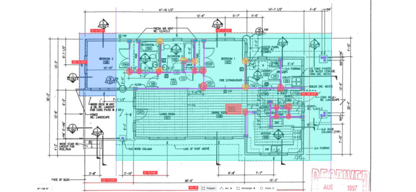 Once again, due to the quality of the drawings, the software was unable to automatically set the scale, and when attempting the AI-automated quantity takeoff, the obtained results were inaccurate with multiple tracing inconsistencies. Because of this, it was determined that this section would instead be used to test the manual tools available in Togal.AI, specifically tracing interior wall perimeters with linear classifications for two wall types (plumbing and standard wall), counting exterior 6x6 columns with count classifications, and calculating square footage of sheathing using area classifications.