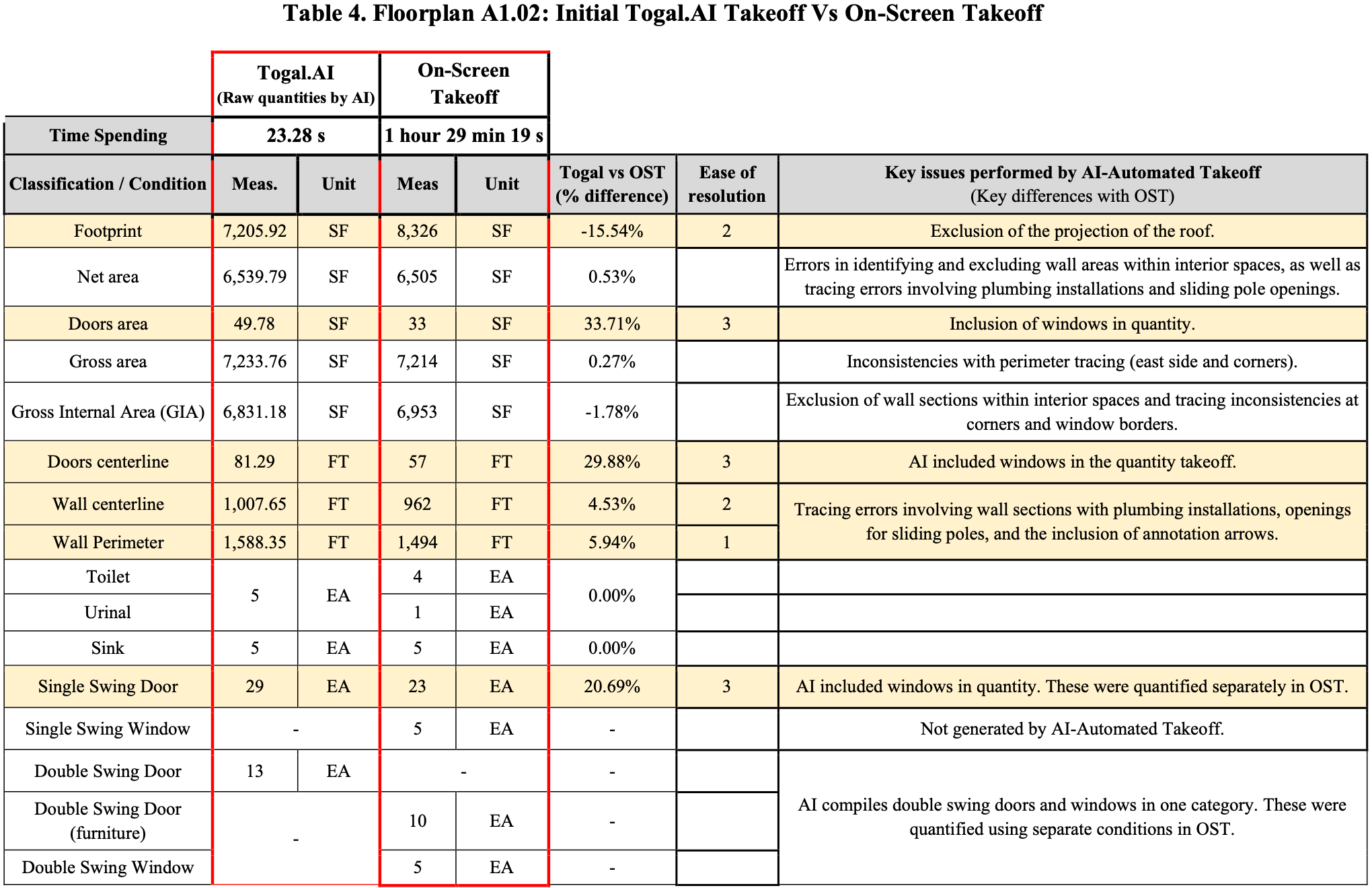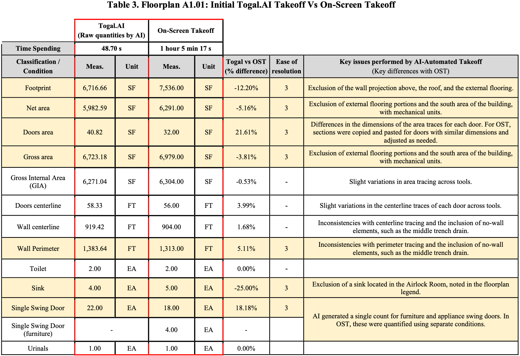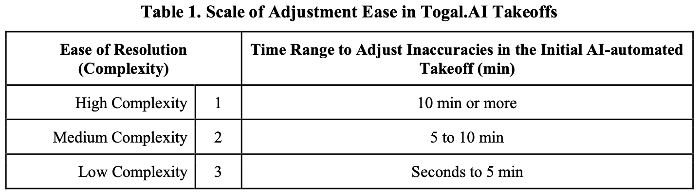 Time to perform takeoffs (AI-generated with adjustments and manual using computer- assisted tools) was recorded. For this case, only key quantities were evaluated: building footprint, gross internal area, wall centerlines, and counts of toilets and single-swing doors. Results were analyzed to identify Togal.AI inconsistencies and perform the necessary adjustments, which were classified by ease of resolution (Table 1). Percentage differences for each quantity between the two tools were also calculated, and overall time savings were determined.