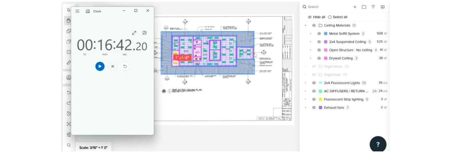 Separately, an initial AI-automated quantity takeoff was performed and timed using Togal.AI to review the quantities generated by the software. However, the tool did not differentiate between the various ceiling materials, types, or elements specified in the drawing. Only predefined classifications for area (footprint, net, and gross area) and linear elements (wall centerline and perimeter) were calculated for the RCP.