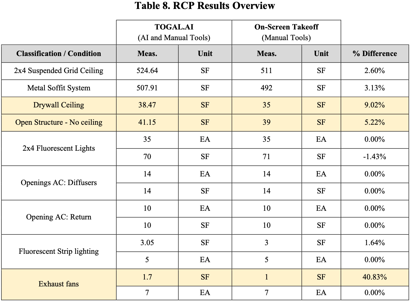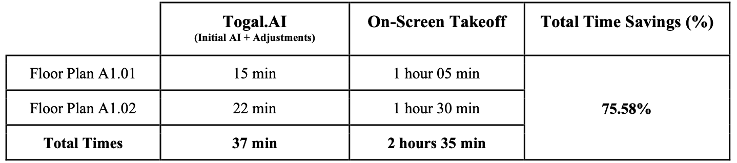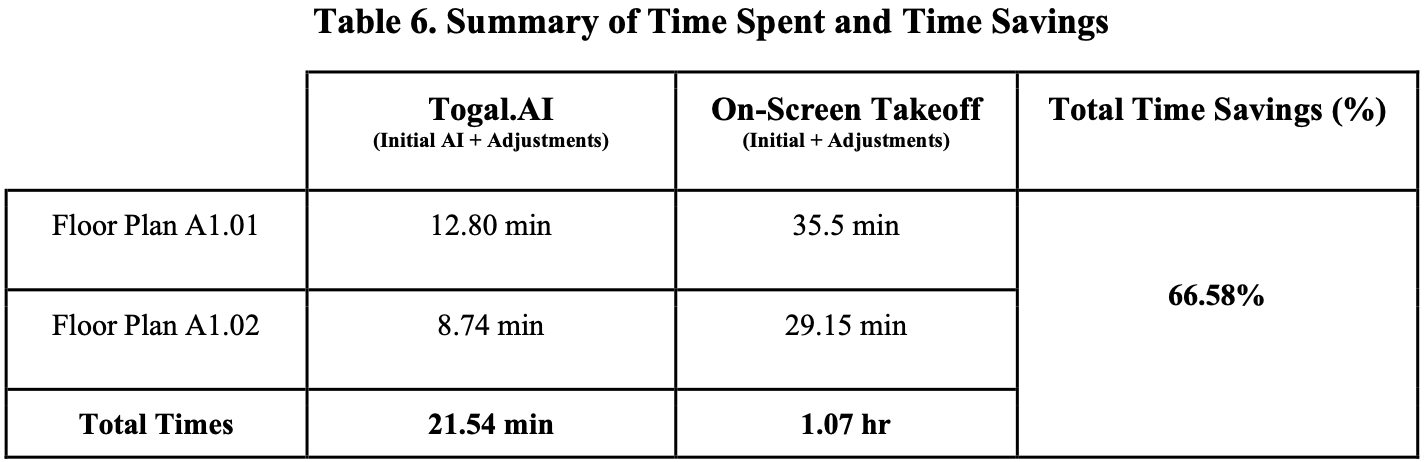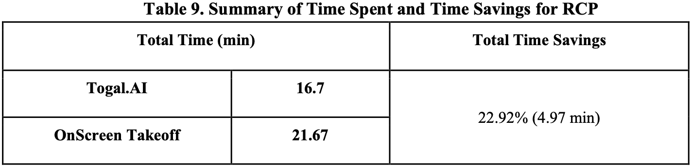 Finally, a comparison between the total time spent using each program was conducted to determine time savings, and a percentage difference based on the adjusted values from Togal.AI was calculated to assess accuracy.