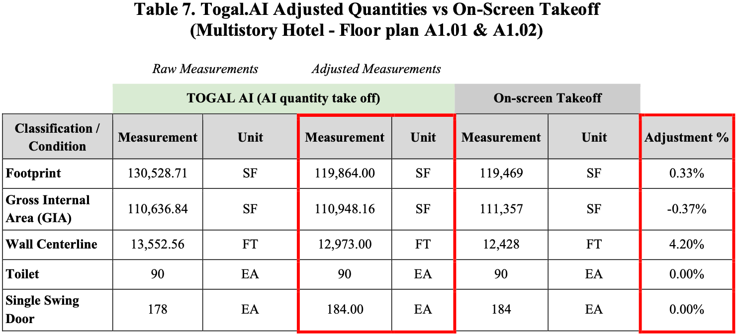 Table B. Floorplan A1.01: Togal.AI Adjusted Quantities vs On-Screen Takeoff