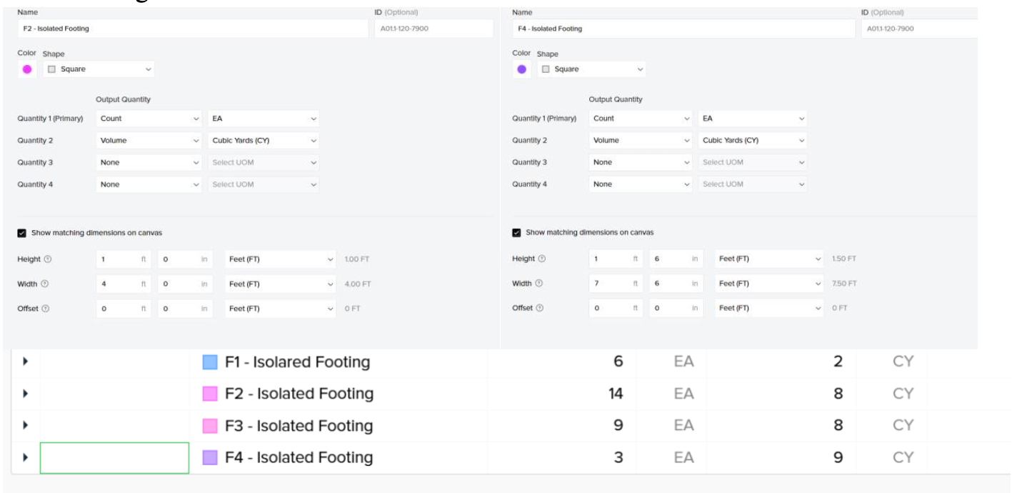 Obtained a count quantity of “F1, “F2”, “F3,” and “F4” isolated foundations with the search AI tool. The text option was used to search for specific text (“F#”), as the program was unable to filter based on the drawing specs.