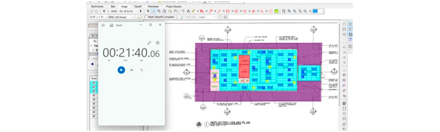 This research acknowledges that going back and forth between estimation software programs to assess accuracy and time savings could introduce bias, as experience and skills may improve over multiple iterations and testing, potentially favoring one tool over the other. To address this, a control case was included to evaluate time savings in quantity takeoffs on a reflective ceiling floor plan (RCP), comparing a combination of AI and manual tools in Togal.AI against computer-assisted manual procedures in On-Screen Takeoff.