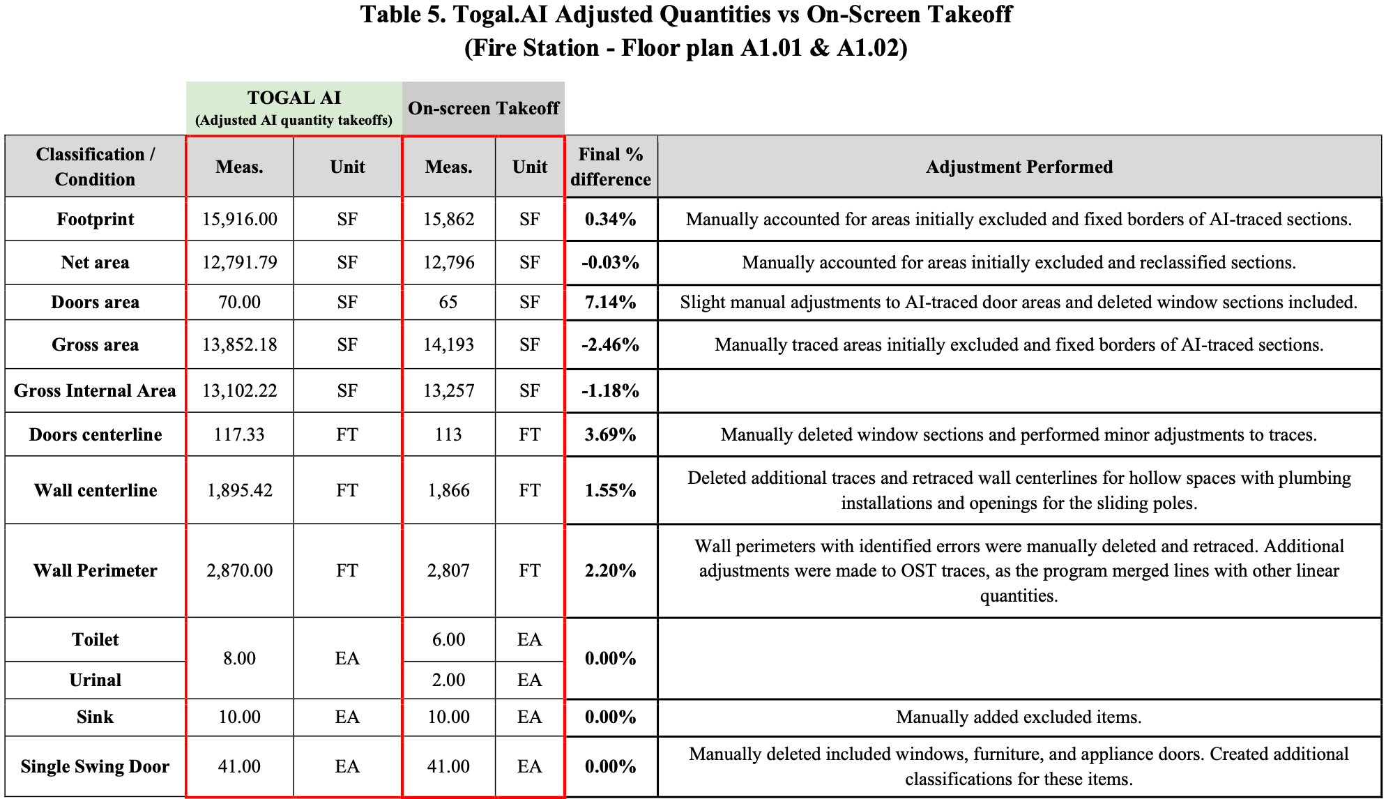 The average time savings of approximately 71% (71.03%) shown across the two main Case Studies (Fire Station and Multi Story Hotel) when using Togal.AI can be attributed to the acceleration provided by AI features. Measurement accuracy, represented by the percentage difference between values obtained in each program, was reduced to below 5% for almost all of the classifications with manual adjustments. For quantities reporting a value above 5%, the unit difference remained minimal.