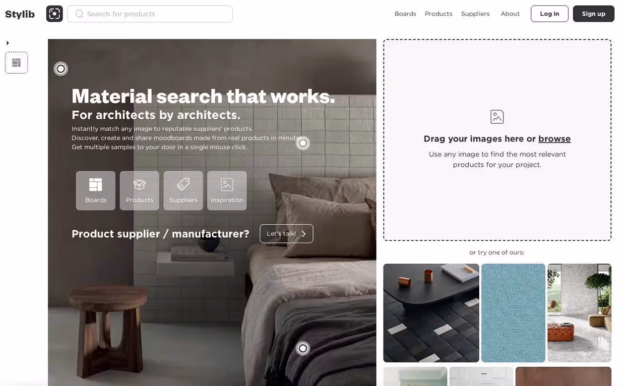 Stylib is an AI-powered material search platform that efficiently matches images with reputable suppliers’ offerings, reducing the time spent on finding materials. Designers can easily create and share moodboards featuring real products, and they can receive multiple product samples with just one mouse click.