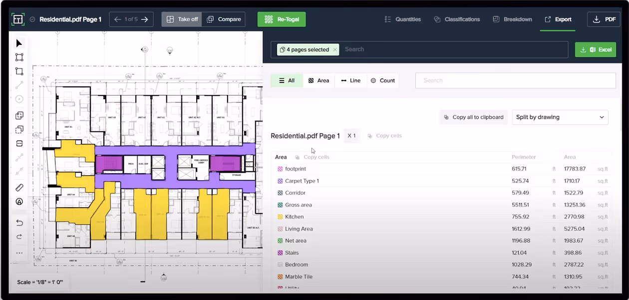 During the pre-construction phase, AI tools like Togal.ai and Workorder.ai facilitate precise cost estimation and bidding processes. Togal.AI solves the most time-consuming part in the bidding process by utilizing cutting-edge deep machine learning technology to analyze blueprints. Workorder is an AI-powered software for cost estimation that uses image recognition, and it detects, measures, and counts relevant objects automatically in the PDF.